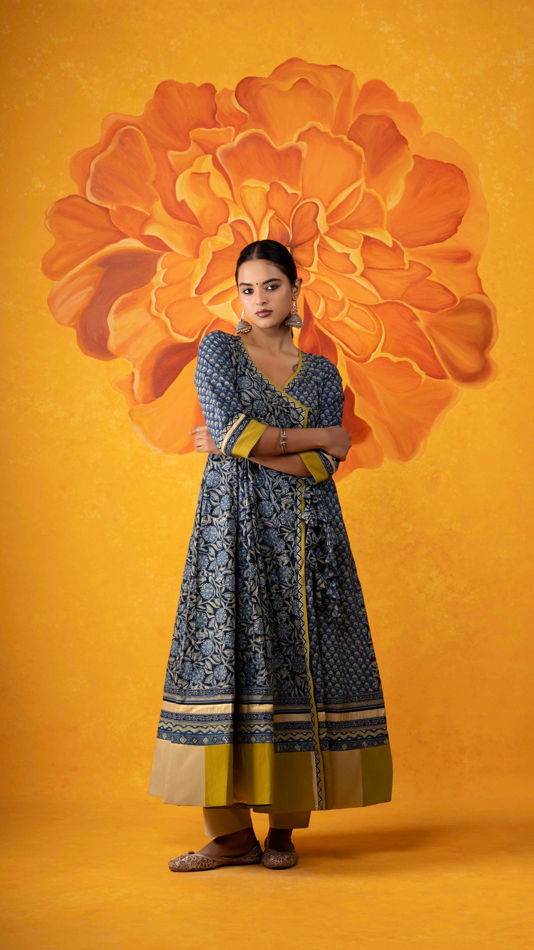 Vamikaa mustard-green Ajrakh handblock printed naturally dyed pure cotton angrakha kalidar kurta - handcrafted and...