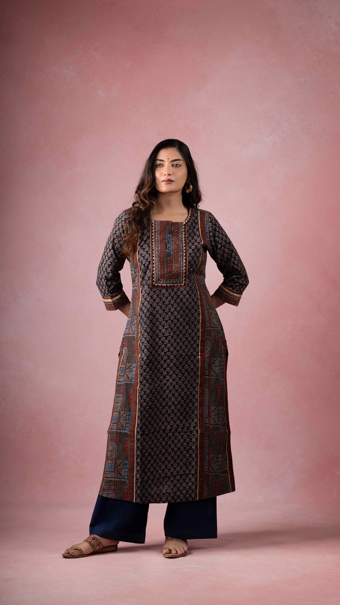 Rua black-indigo blue Ajrakh handblock printed naturally dyed pure cotton straight kurta - handcrafted and...