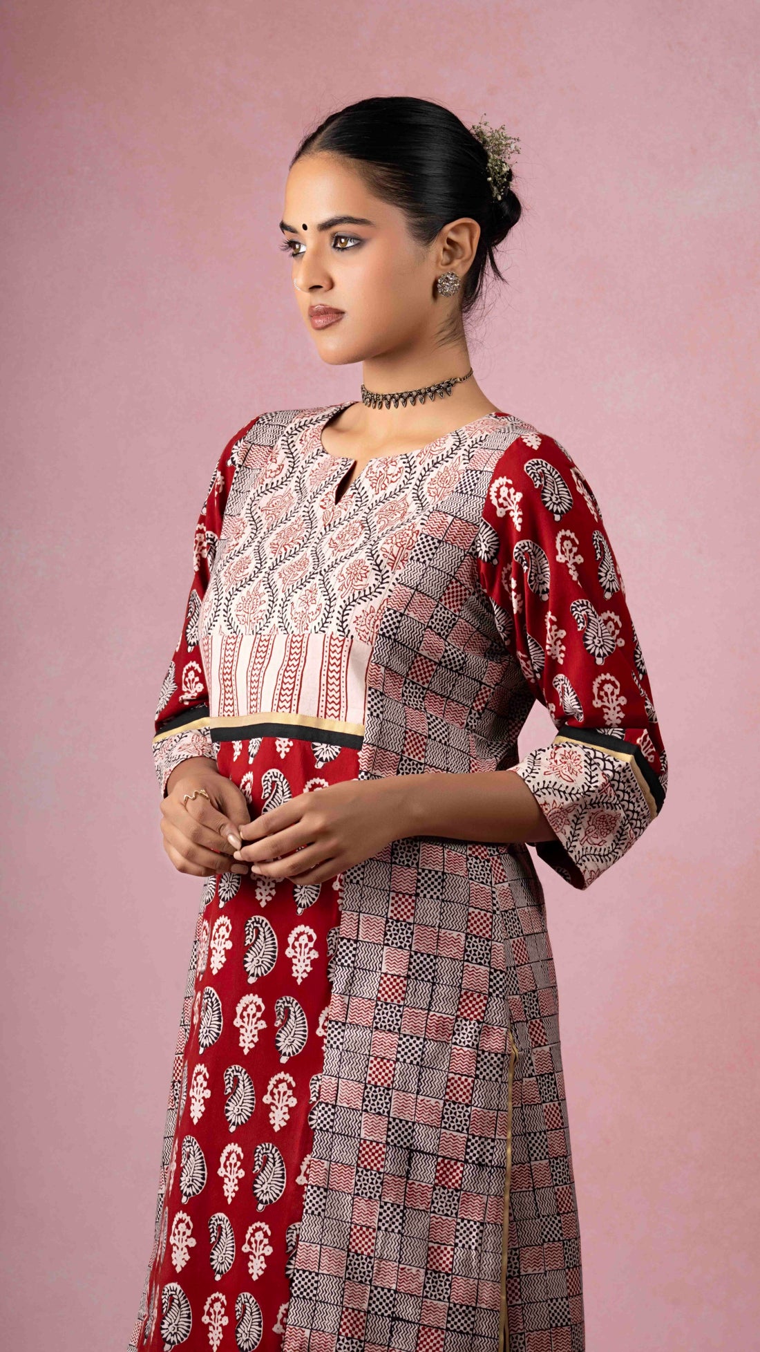 Aashra black-red Bagh handblock printed naturally dyed pure cotton straight kurta - handcrafted and stitched...