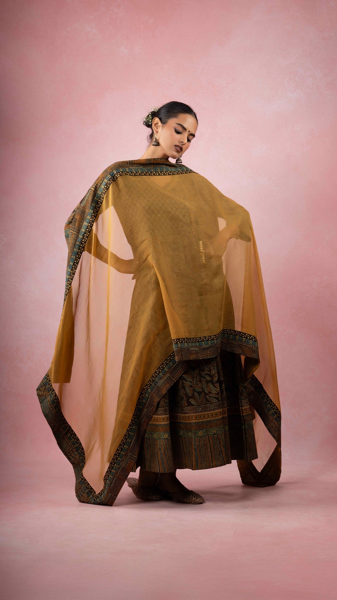 Raha pomegranate yellow Ajrakh handblock printed naturally dyed pure cotton kalidar kurta - handcrafted and...