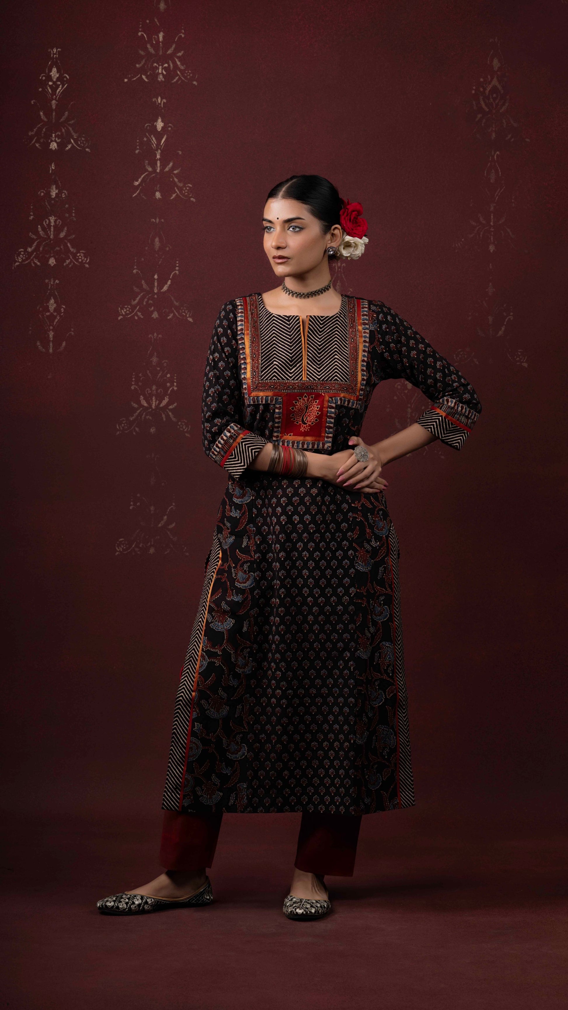 Ahalyaa black-rust Ajrakh handblock printed naturally dyed pure cotton princess cut kurta - handcrafted and stitched by skilled artisans.