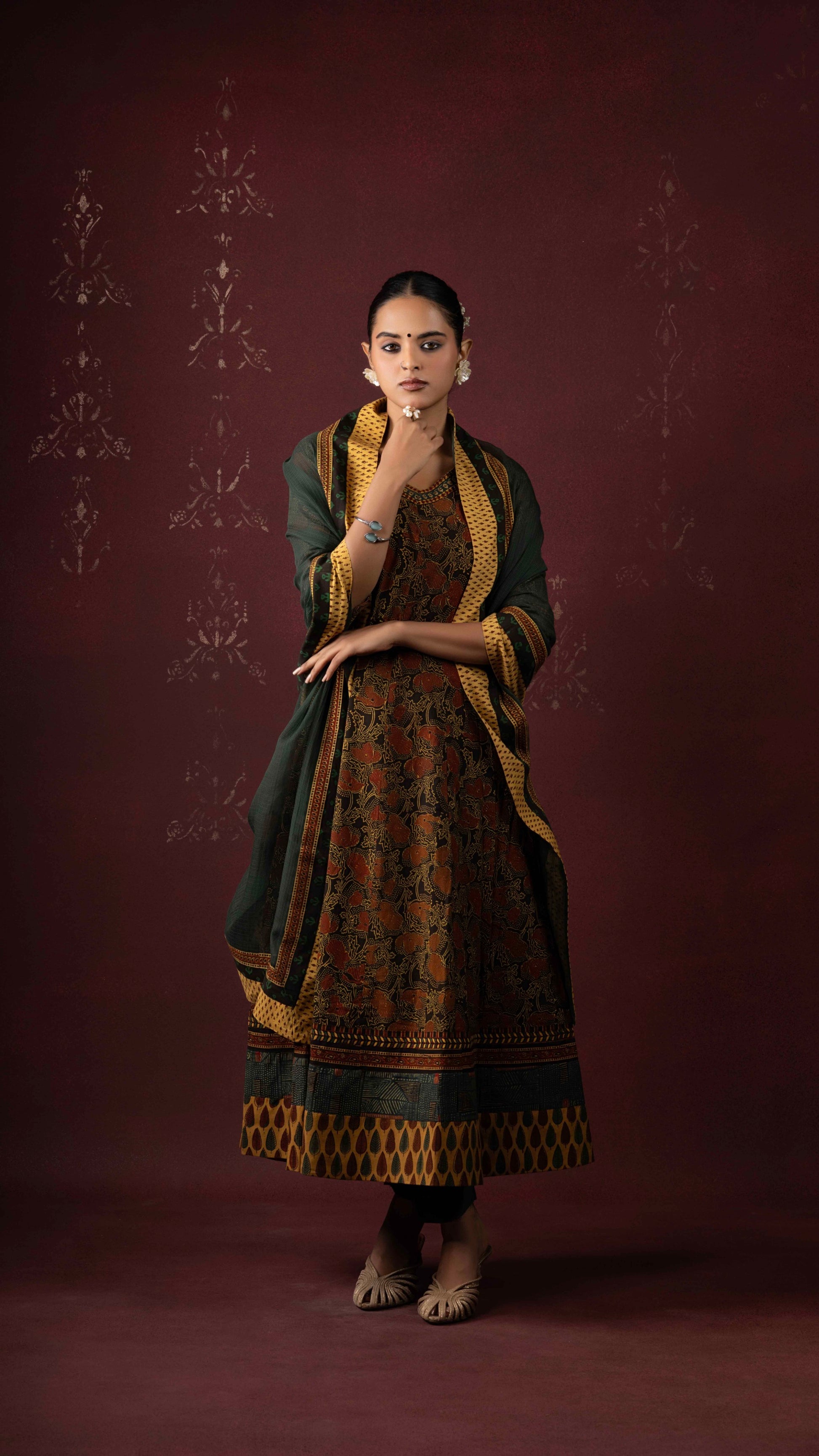 Elika black-rust Ajrakh handblock printed naturally dyed pure cotton kalidar kurta - handcrafted and stitched by skilled artisans.