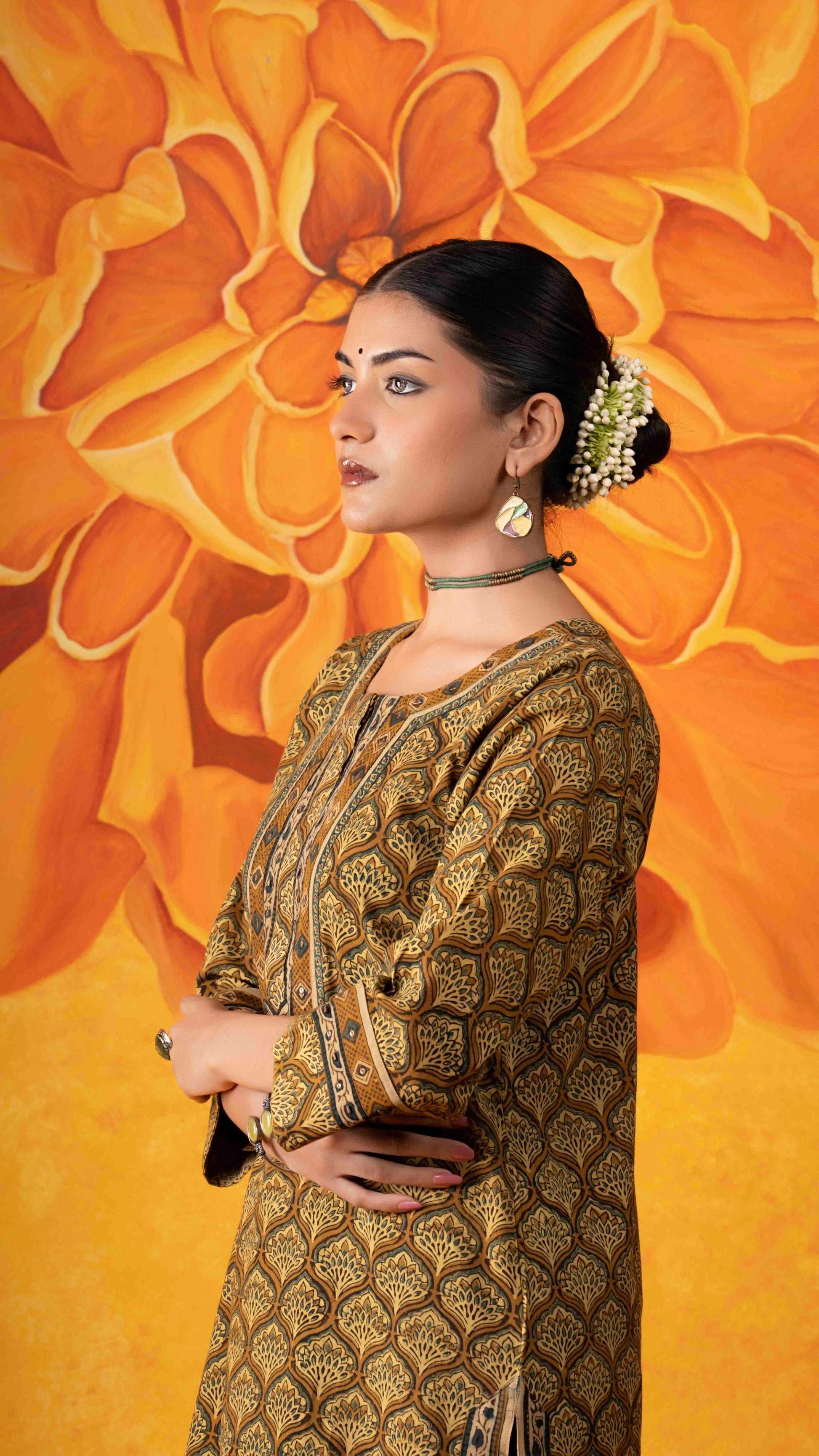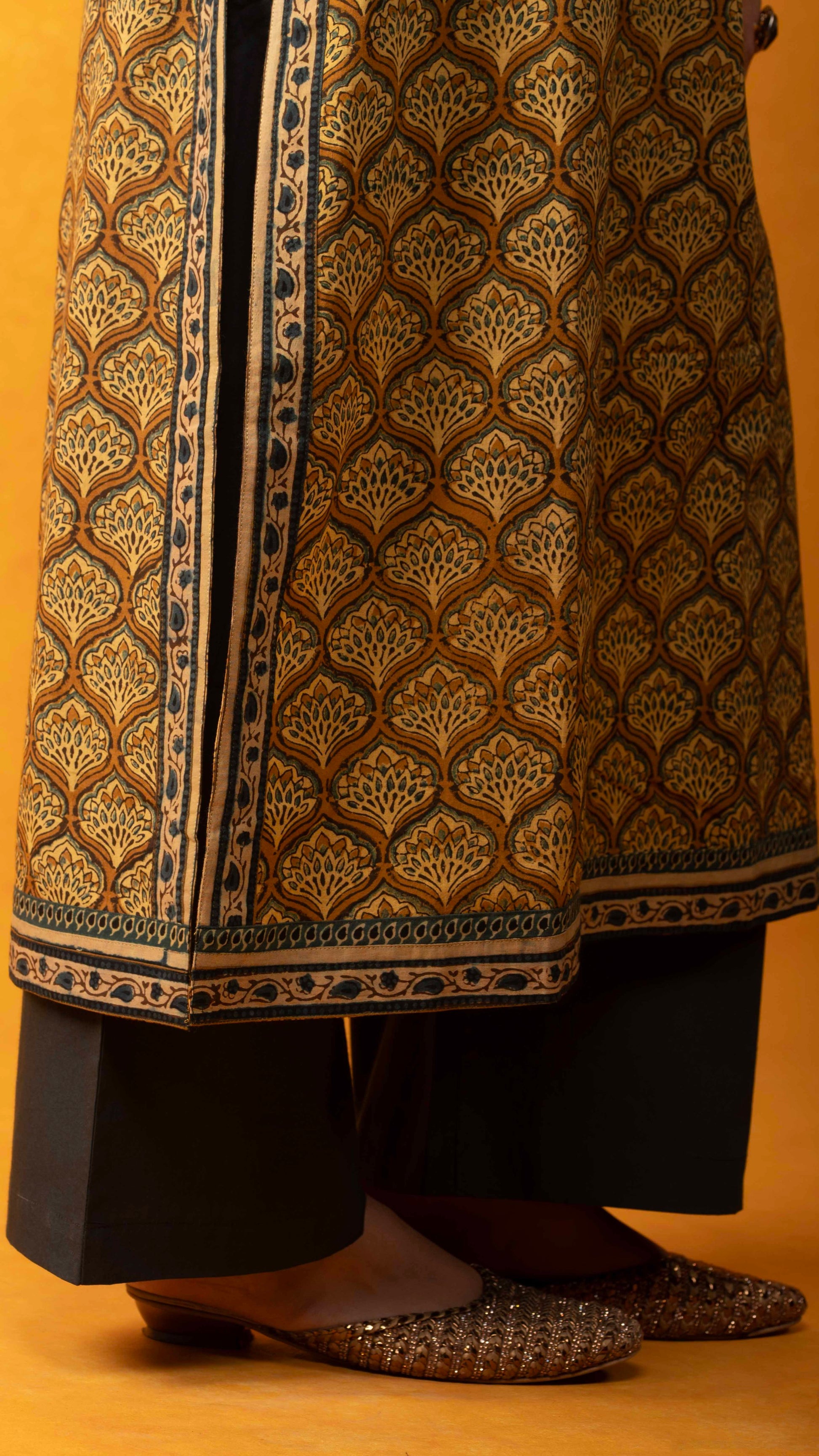 Ezhili mustard yellow Ajrakh handblock printed naturally dyed pure cotton straight kurta - handcrafted and stitched by skilled artisans.