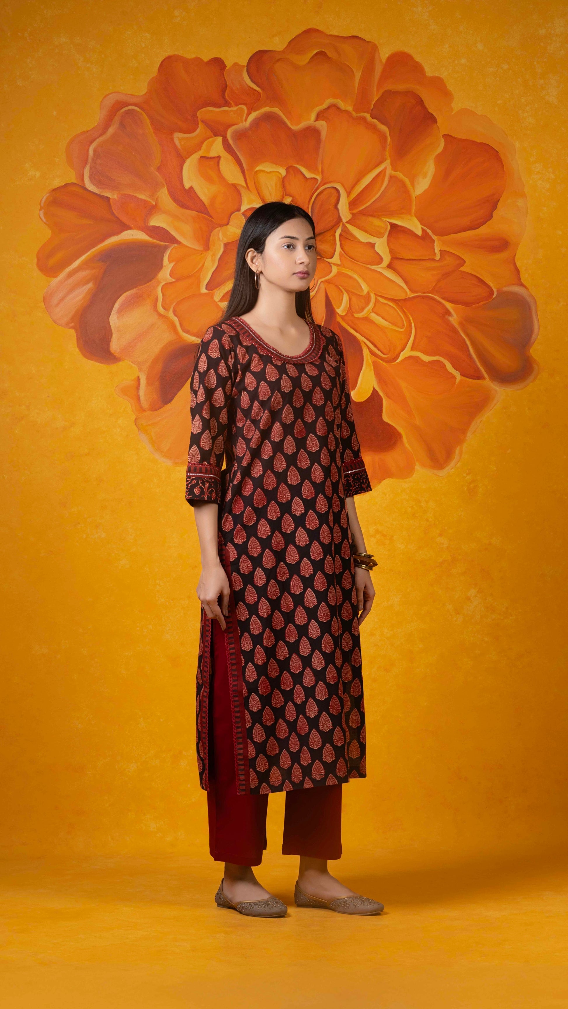 Irayaka black-red Ajrakh handblock printed naturally dyed pure cotton straight kurta - handcrafted and stitched by skilled artisans.