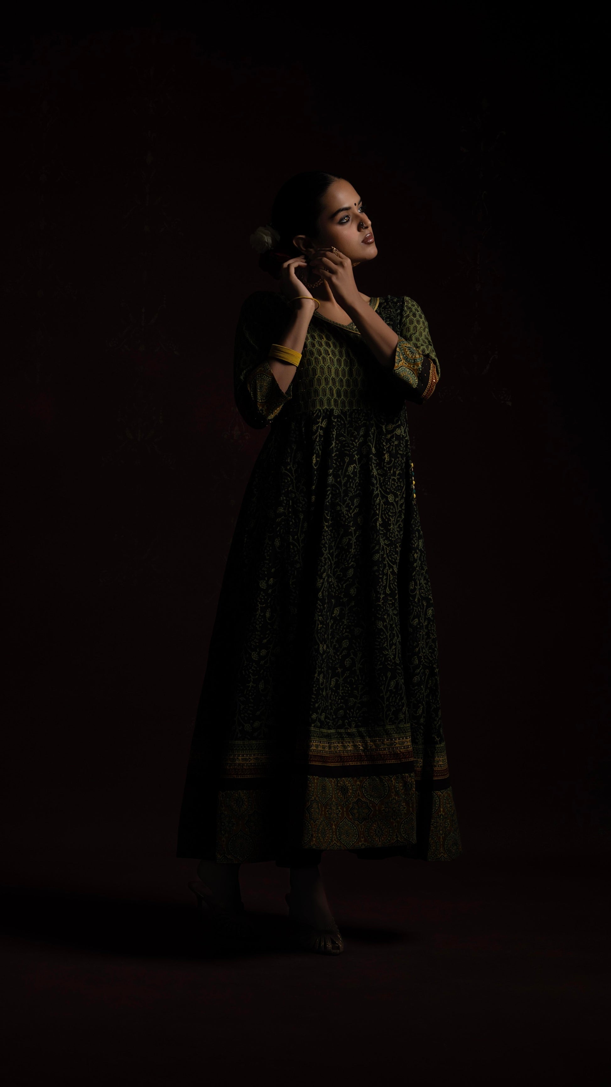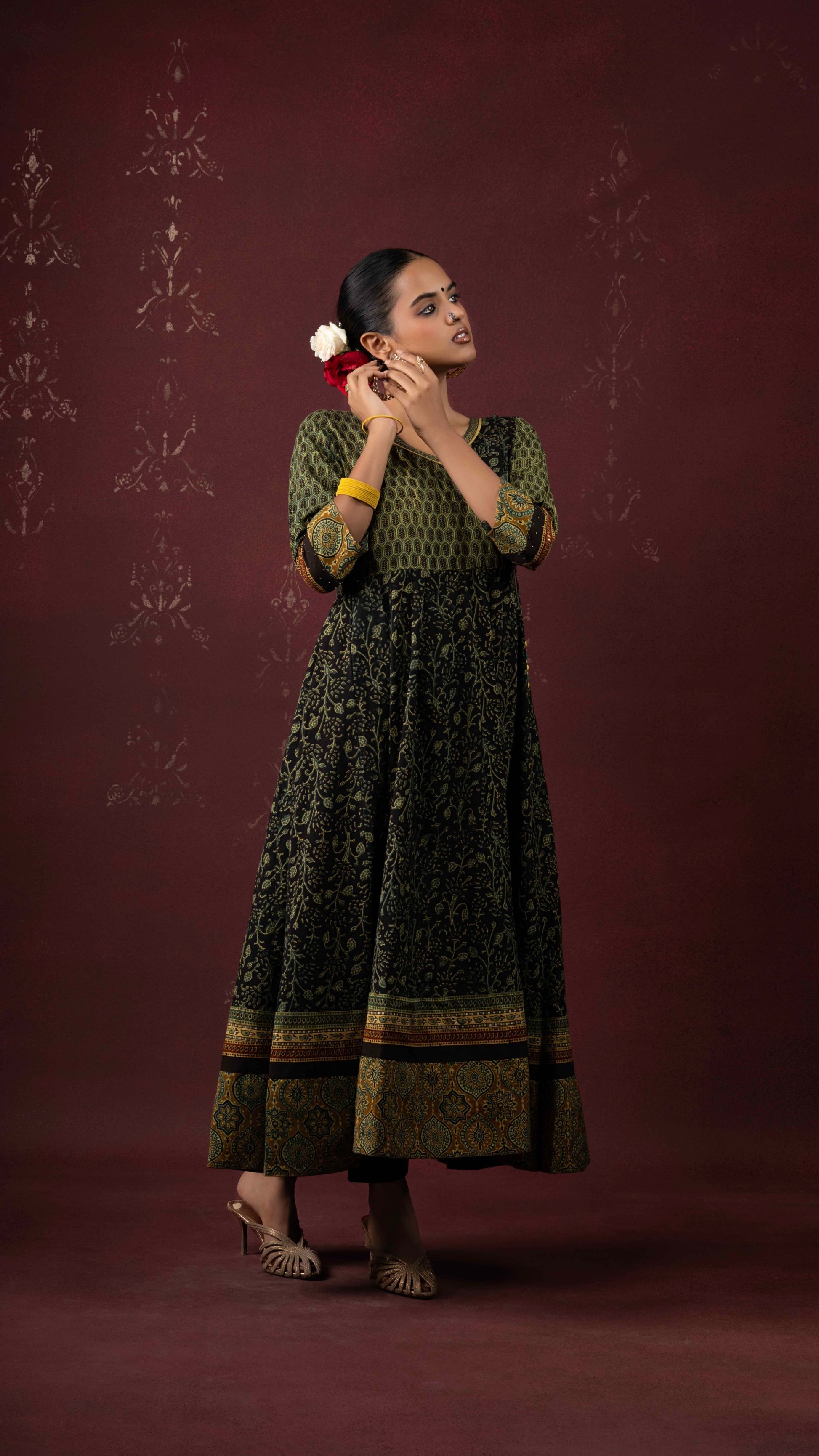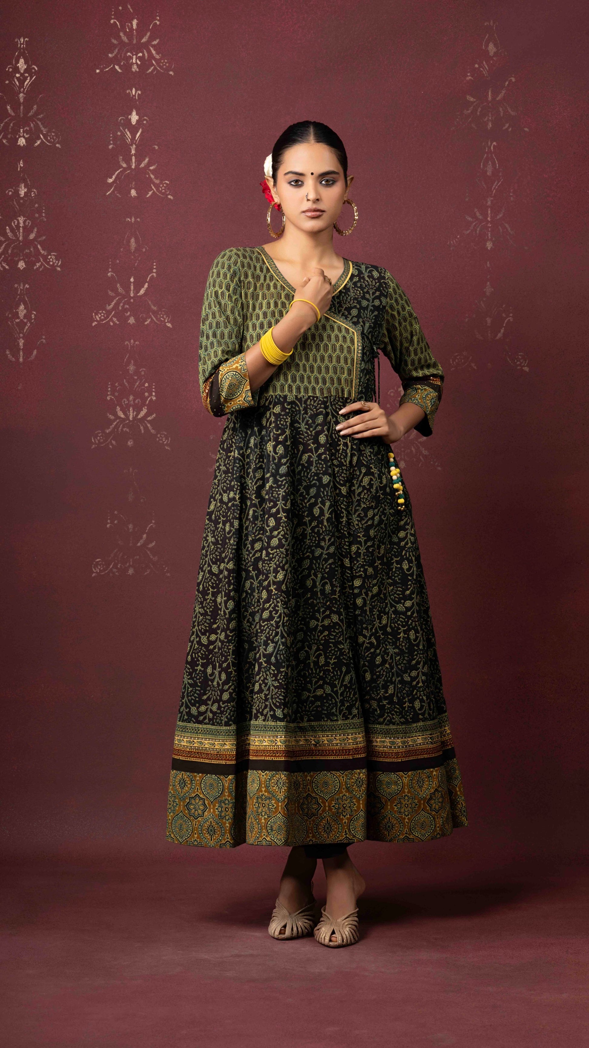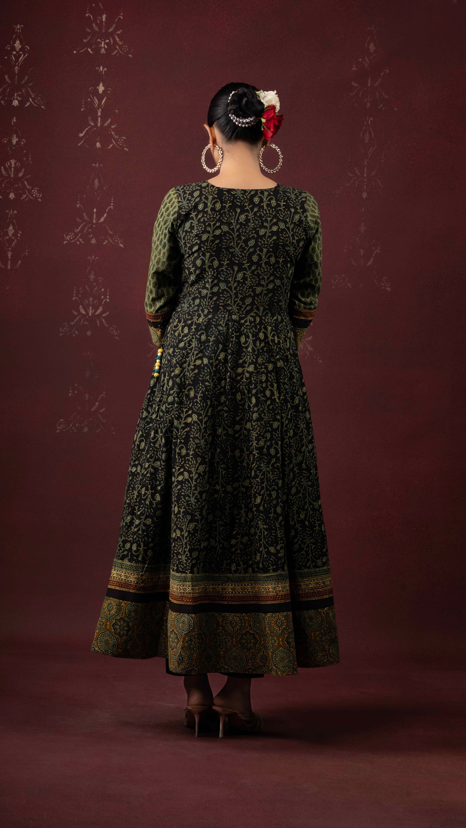 Kairaa black-green Ajrakh handblock printed naturally dyed pure cotton kalidar kurta - handcrafted and stitched by skilled artisans.