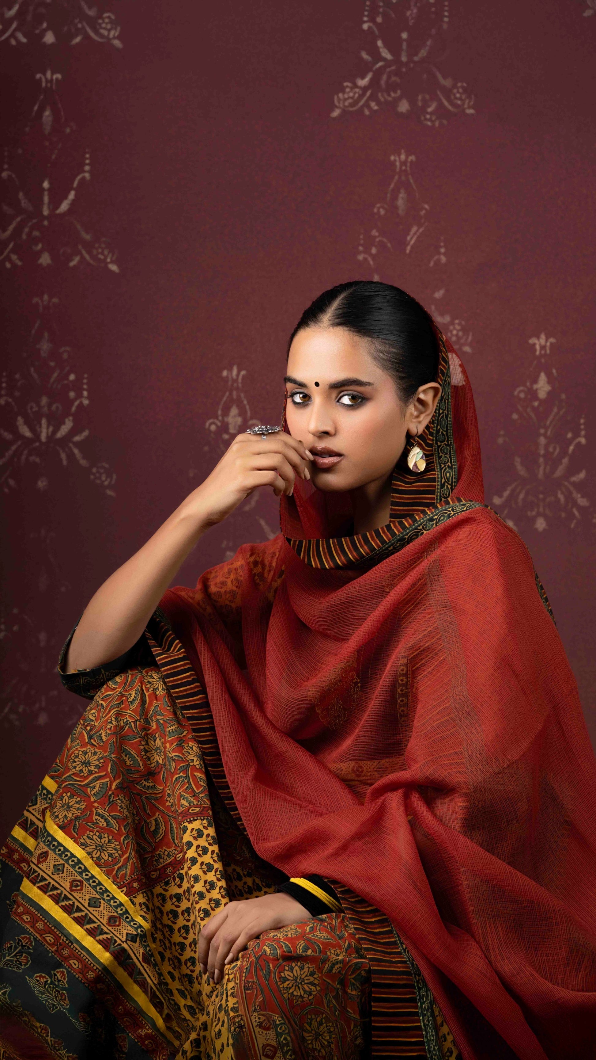Mehrnaz rust, azo-free dyed Kota Doria dupatta, bordered with artisan-stitched delicate Ajrakh trims - handcrafted and stitched by skilled artisans.