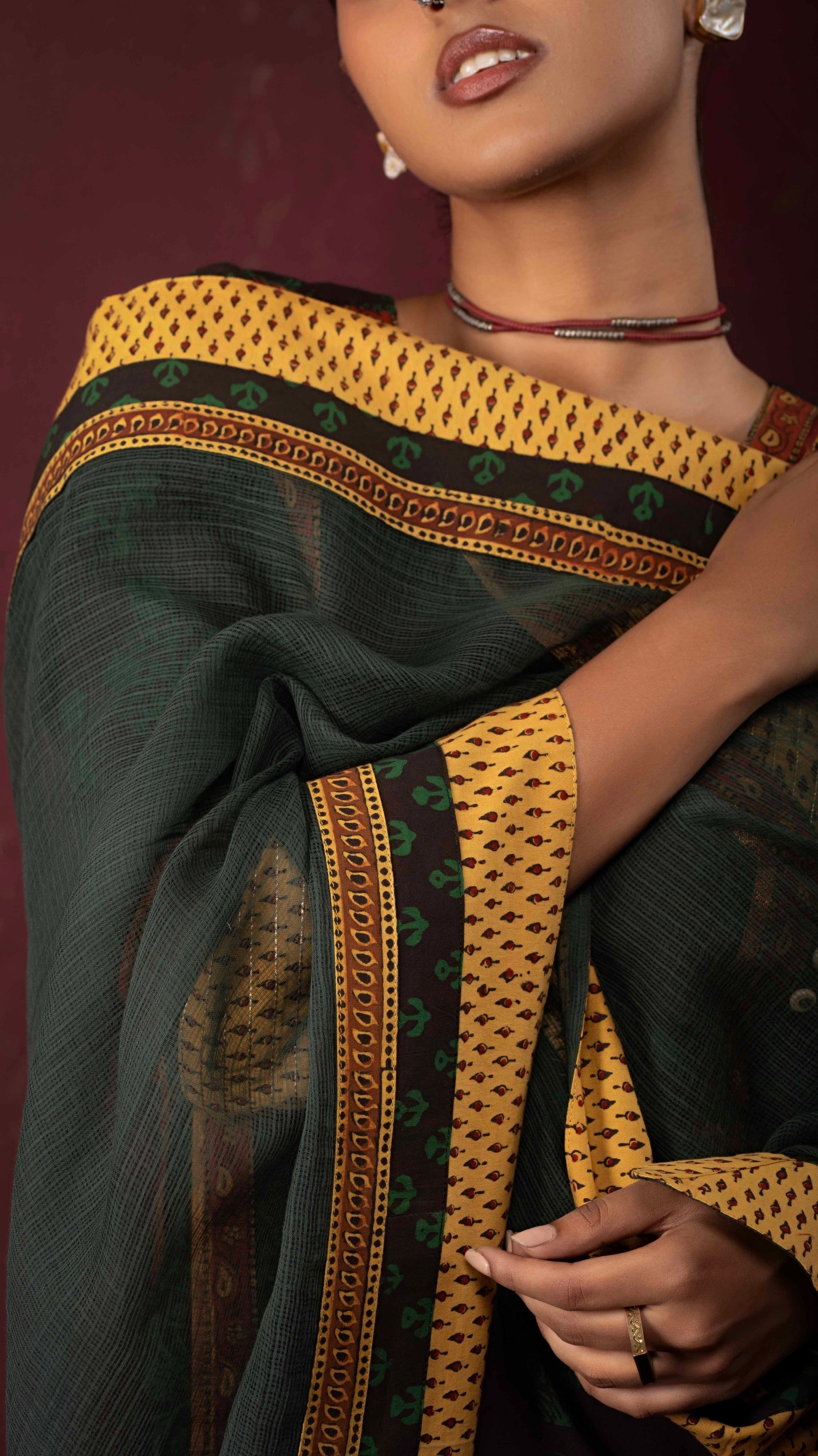 Nargis green, azo-free dyed Kota Doria dupatta, bordered with artisan-stitched delicate Ajrakh and Bagh trims - handcrafted and stitched by skilled artisans.