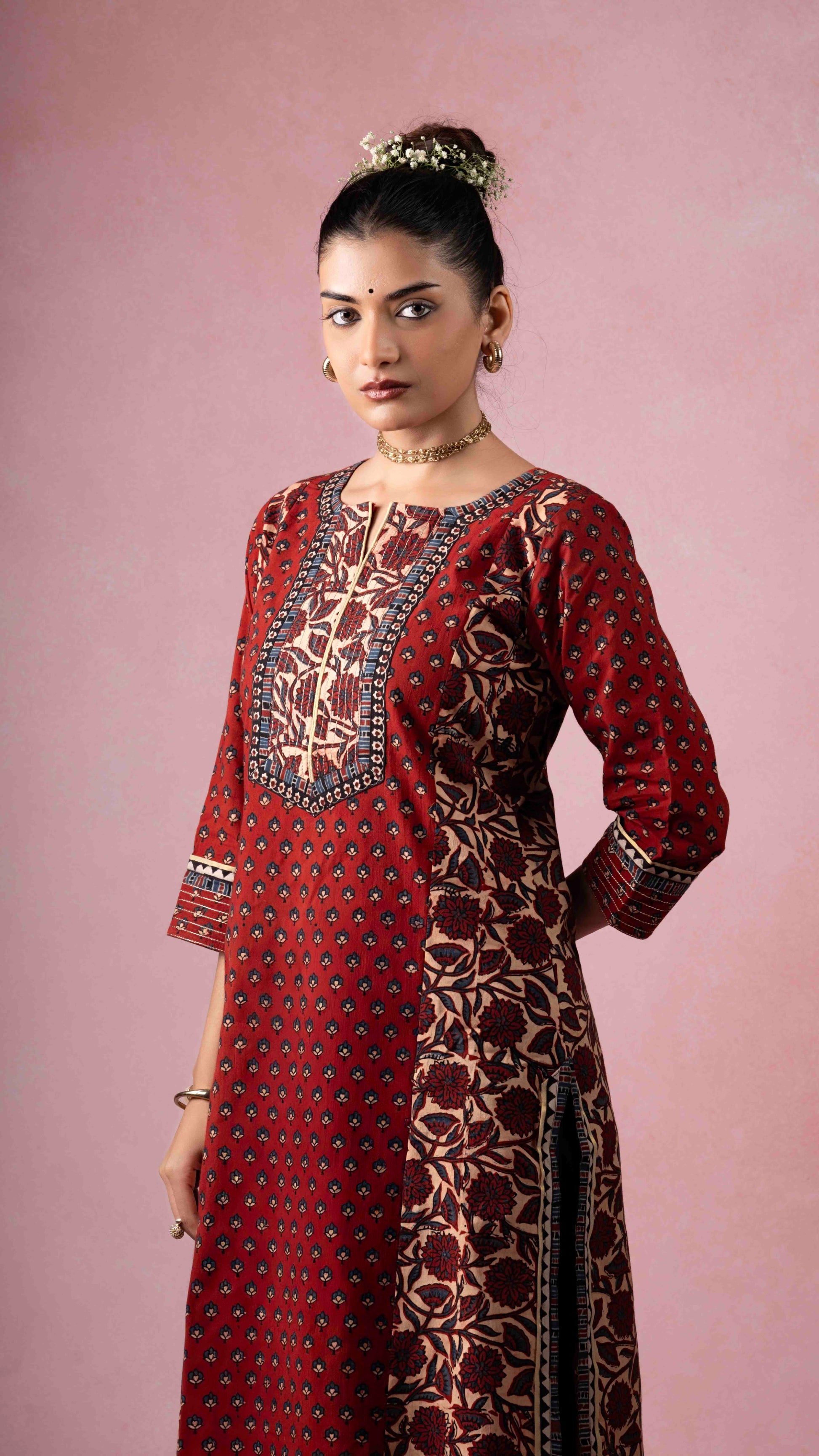 Nooriya rust-indigo blue Ajrakh handblock printed naturally dyed pure cotton princess cut kurta - handcrafted and stitched by skilled artisans.