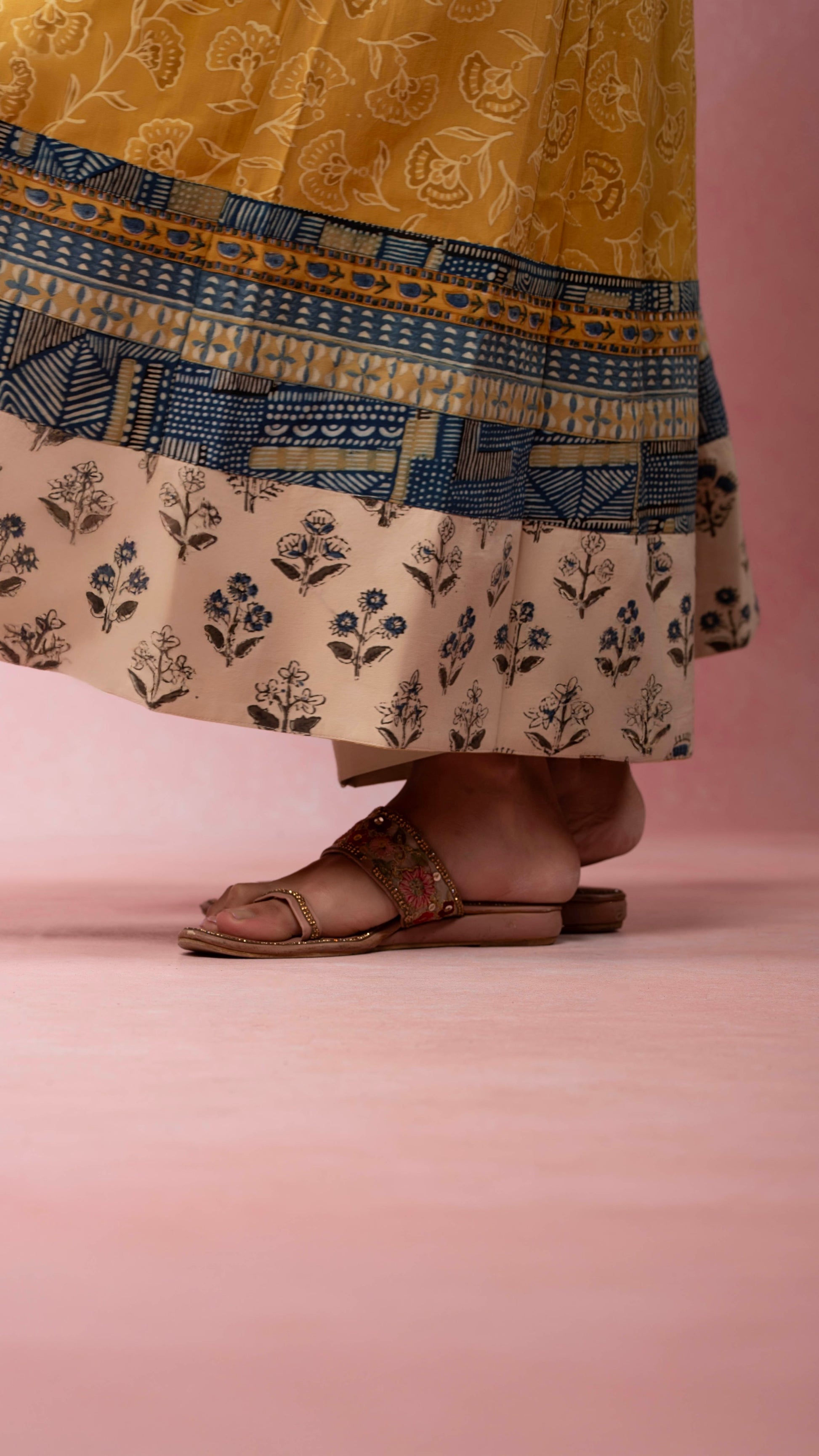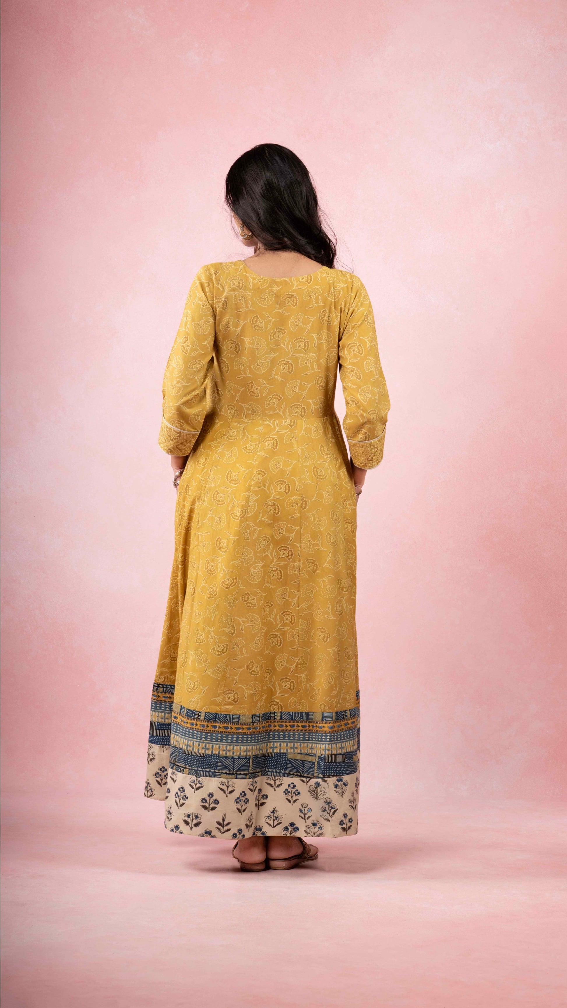 Raha pomegranate yellow Ajrakh handblock printed naturally dyed pure cotton kalidar kurta - handcrafted and stitched by skilled artisans.