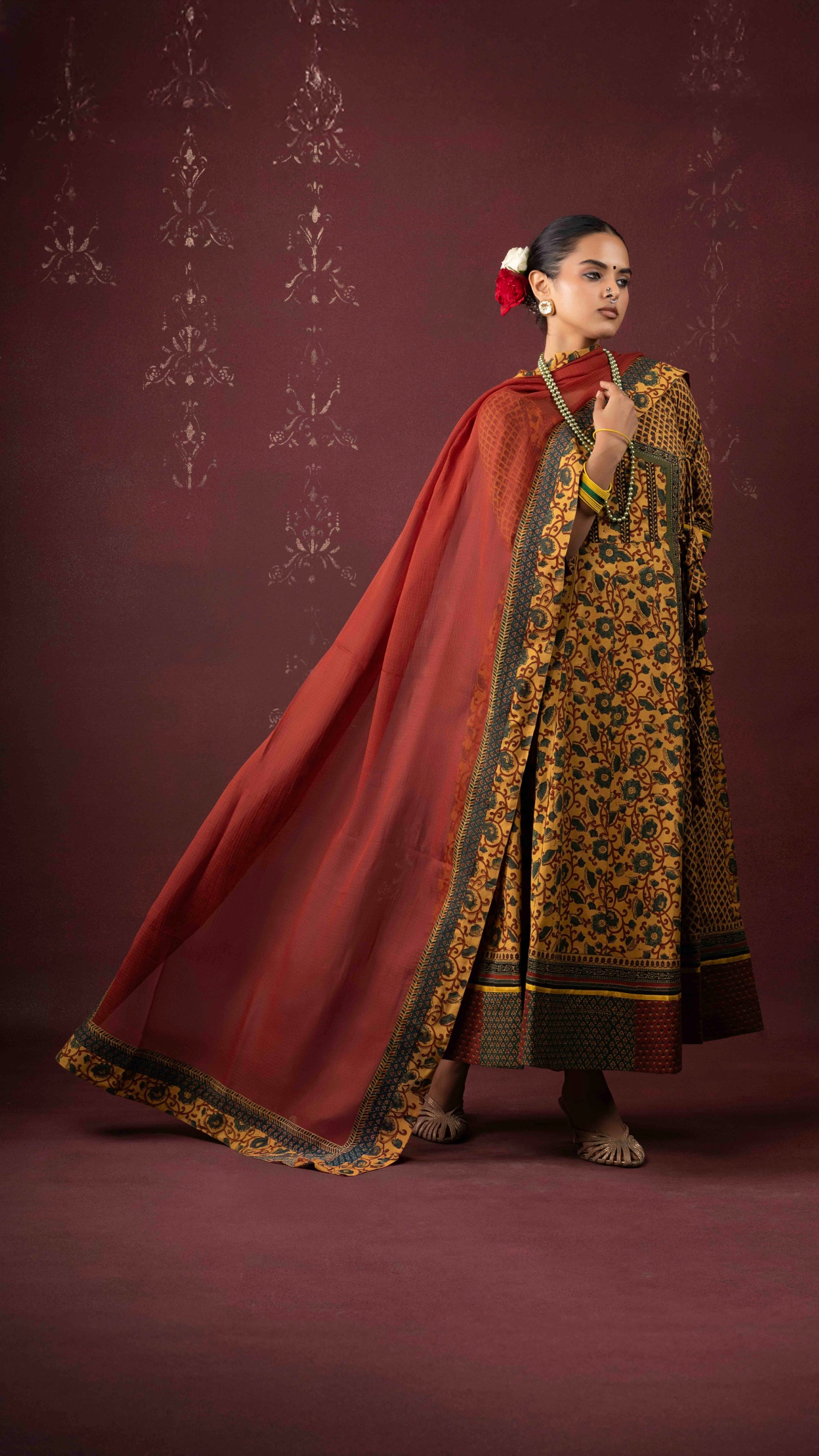 Roxana rust, azo-free dyed Kota Doria dupatta, bordered with artisan-stitched delicate Ajrakh trims - handcrafted and stitched by skilled artisans.