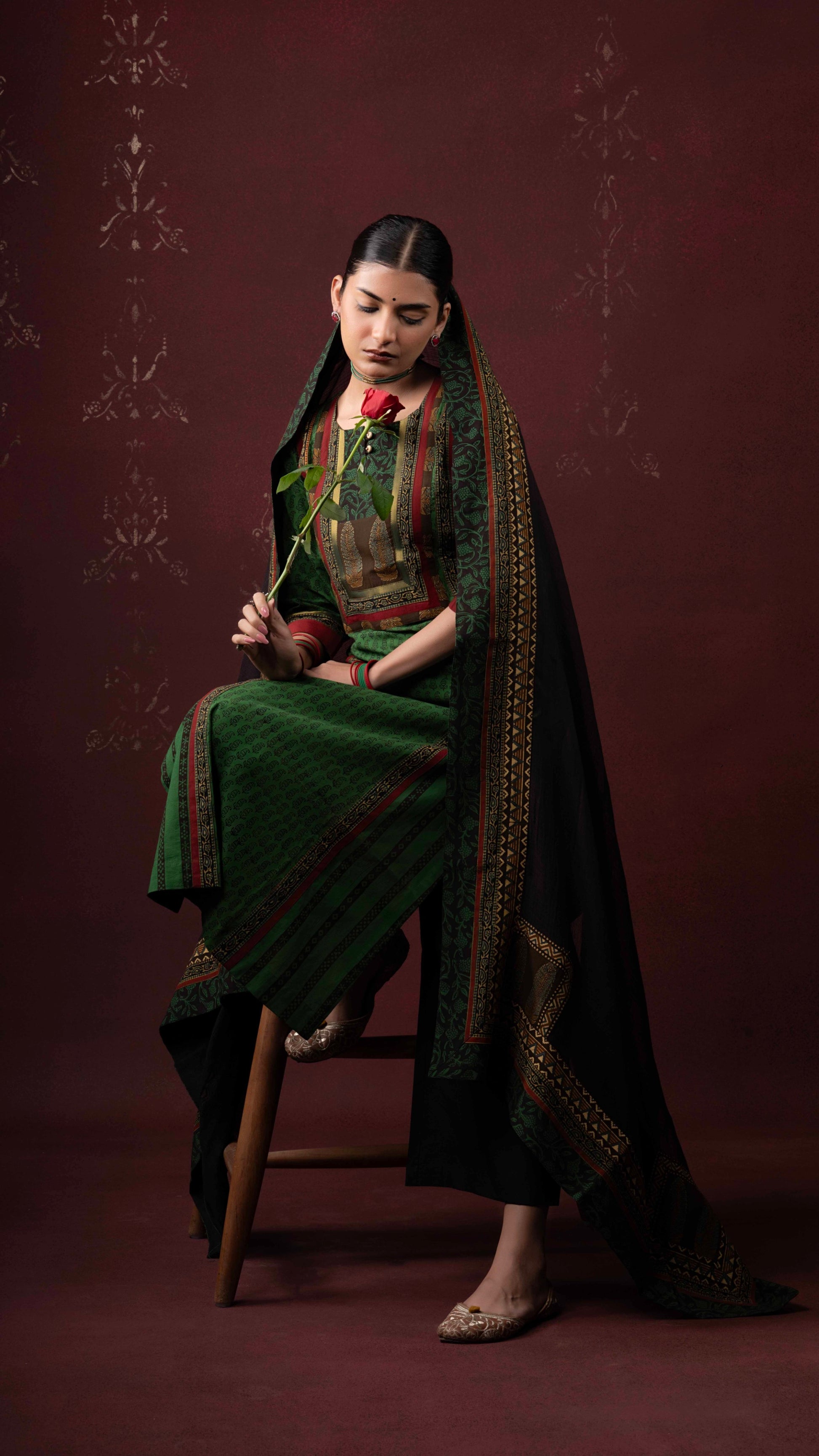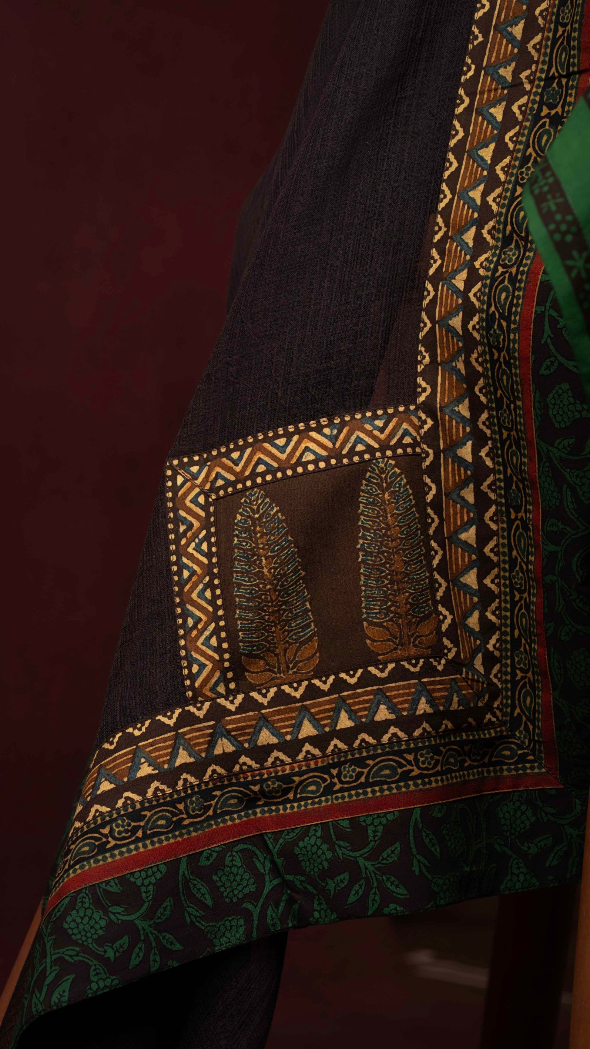 Sohini black, azo-free dyed Kota Doria dupatta, bordered with artisan-stitched delicate Ajrakh and Bagh trims - handcrafted and stitched by skilled artisans.