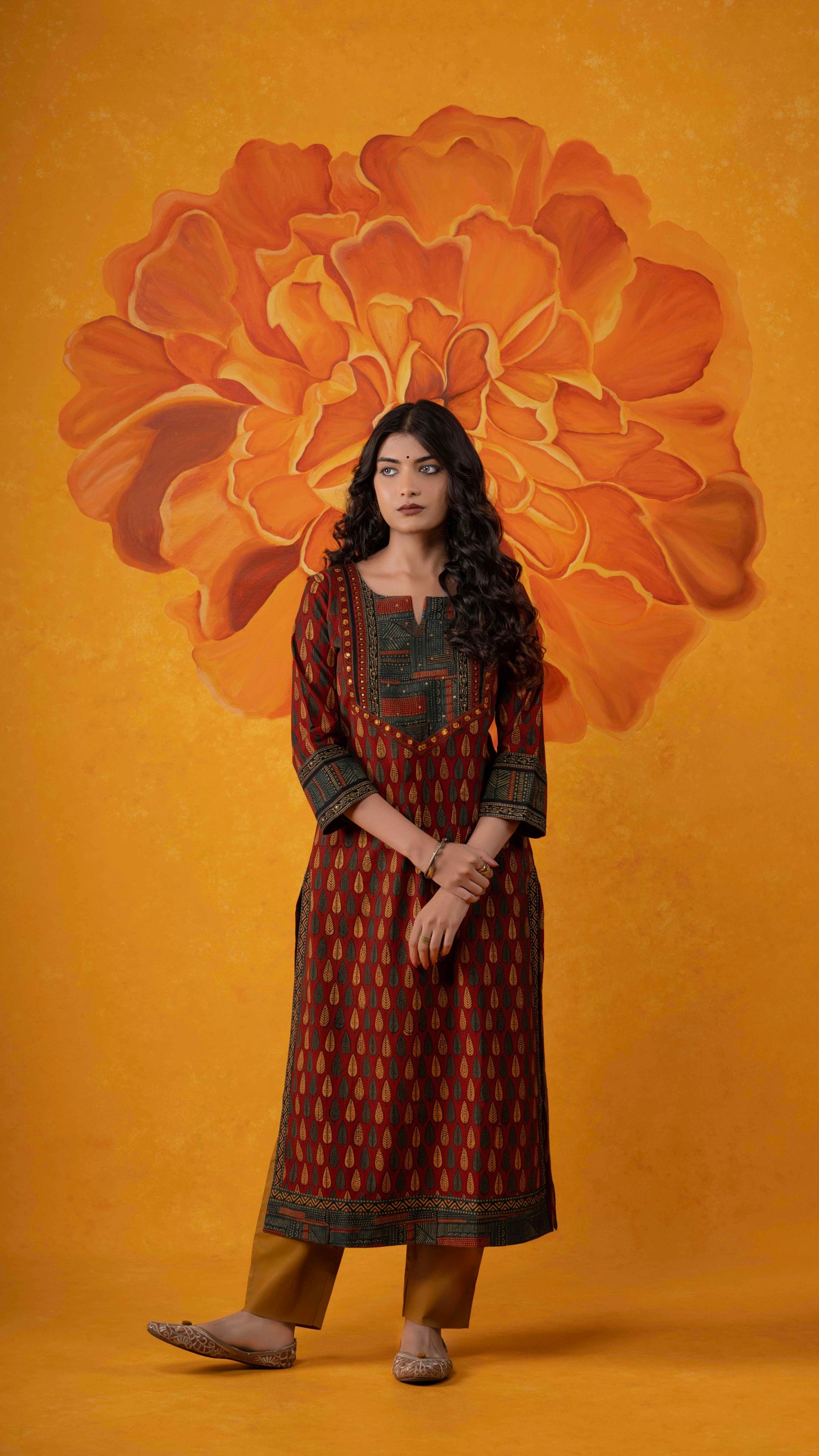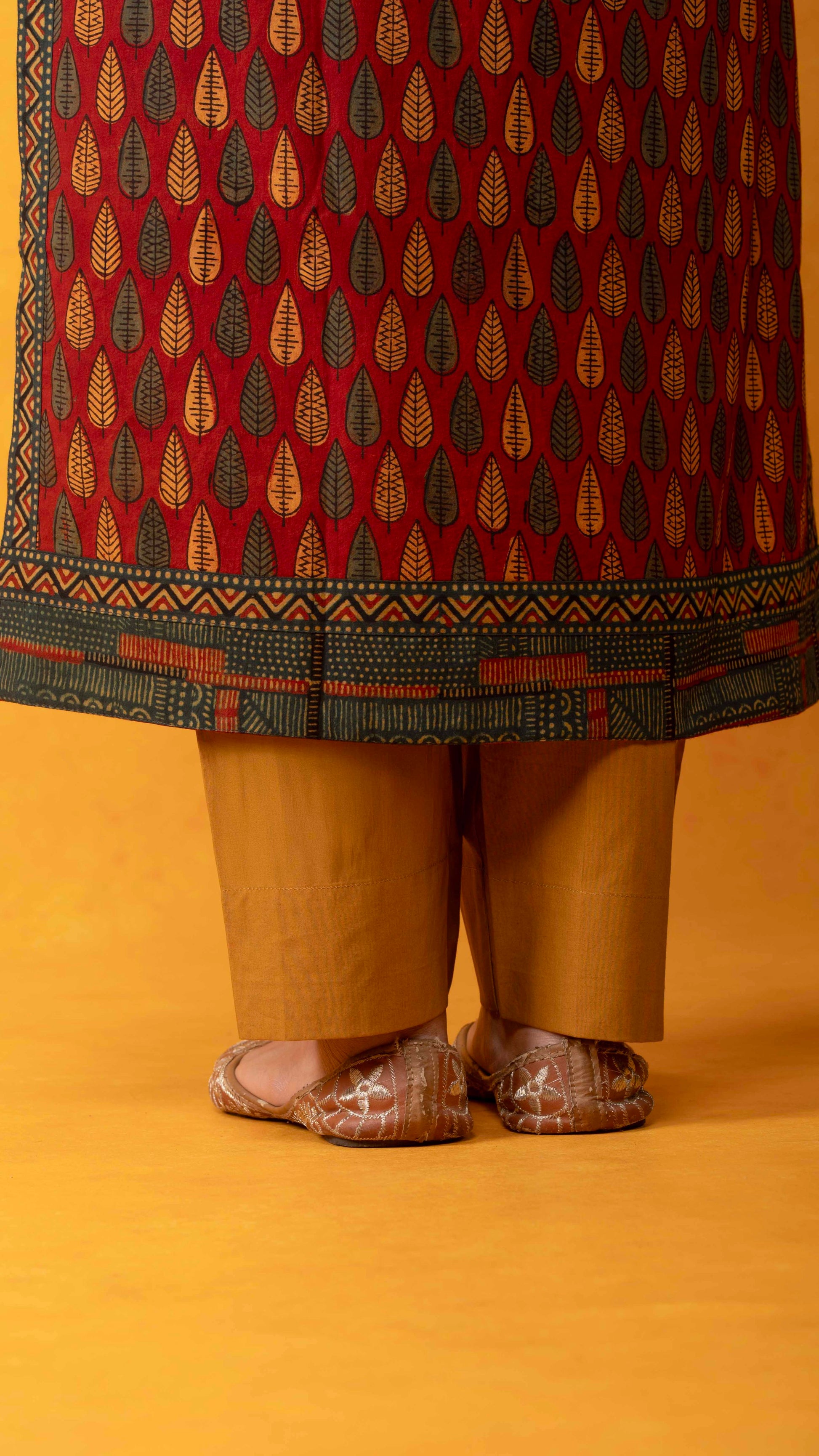 Vaani rust Ajrakh handblock printed naturally dyed pure cotton straight kurta - handcrafted and stitched by skilled artisans.