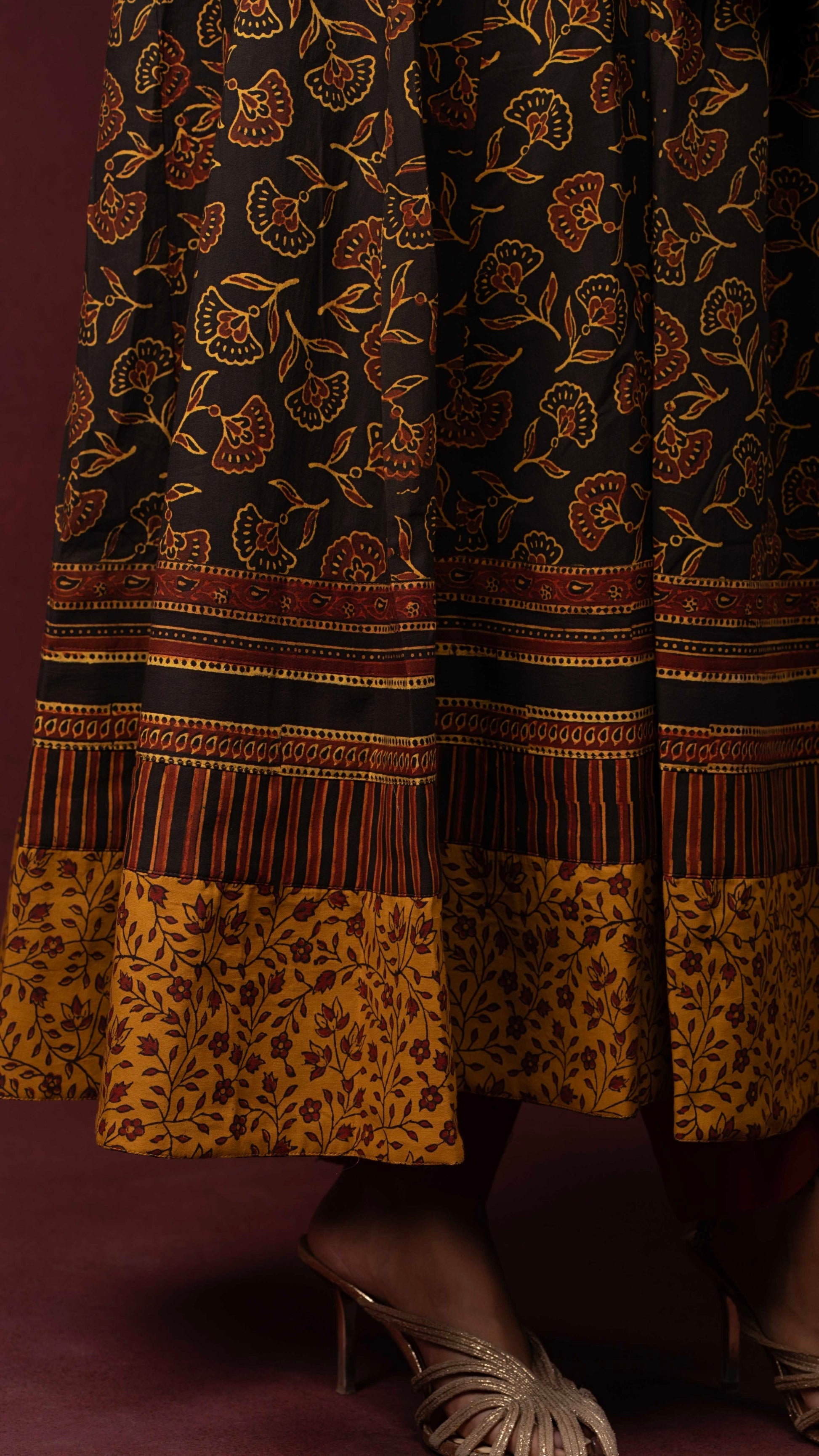 Vamyaa black-mustard Ajrakh handblock printed naturally dyed pure cotton kalidar kurta - handcrafted and stitched by skilled artisans.